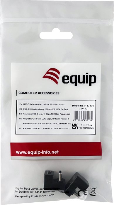 Equip Adaptador USB-C U plug, 10Gbps, PD 100W , 2-Pack. Conector 1: USB C, Conector 2: USB C. Color del producto: Negro